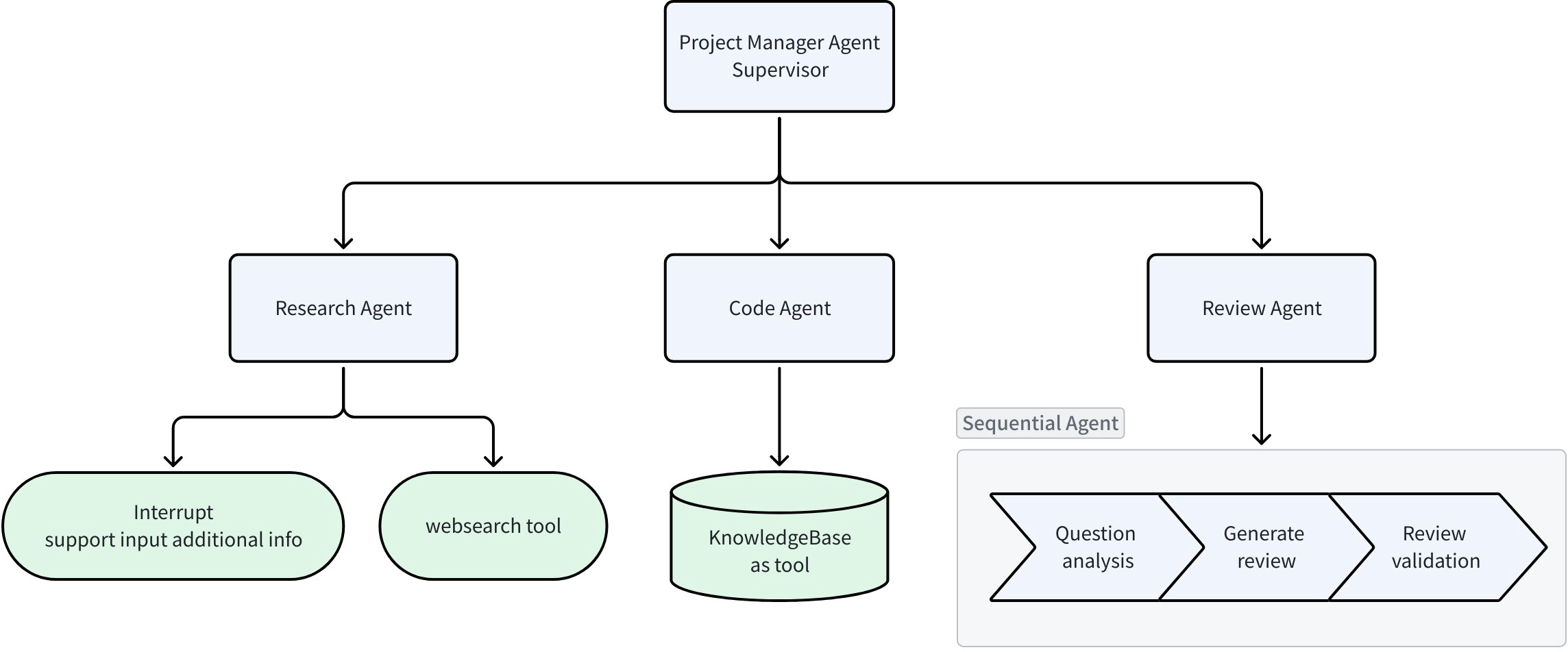 supervisorAgent, err := supervisor.New(ctx, &supervisor.Config{ Supervisor: s, SubAgents: []adk.Agent{researchAgent, codeAgent, reviewAgent} })