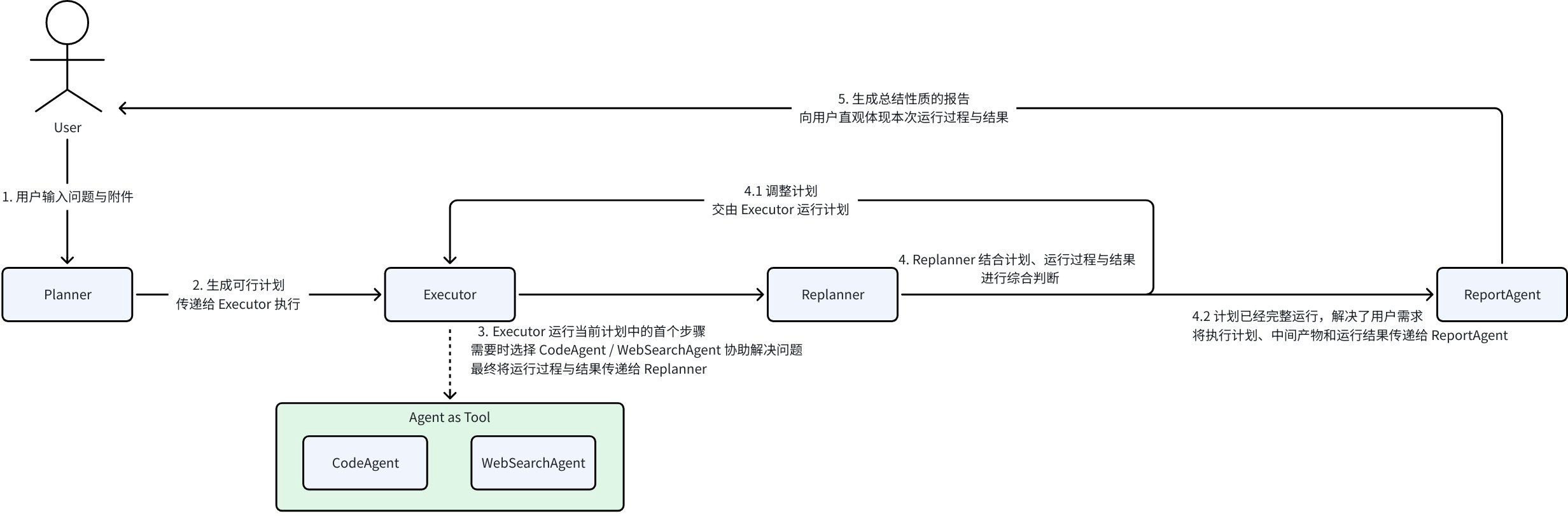 - Executor: call tools (Excel reading, system commands, Python) to perform steps